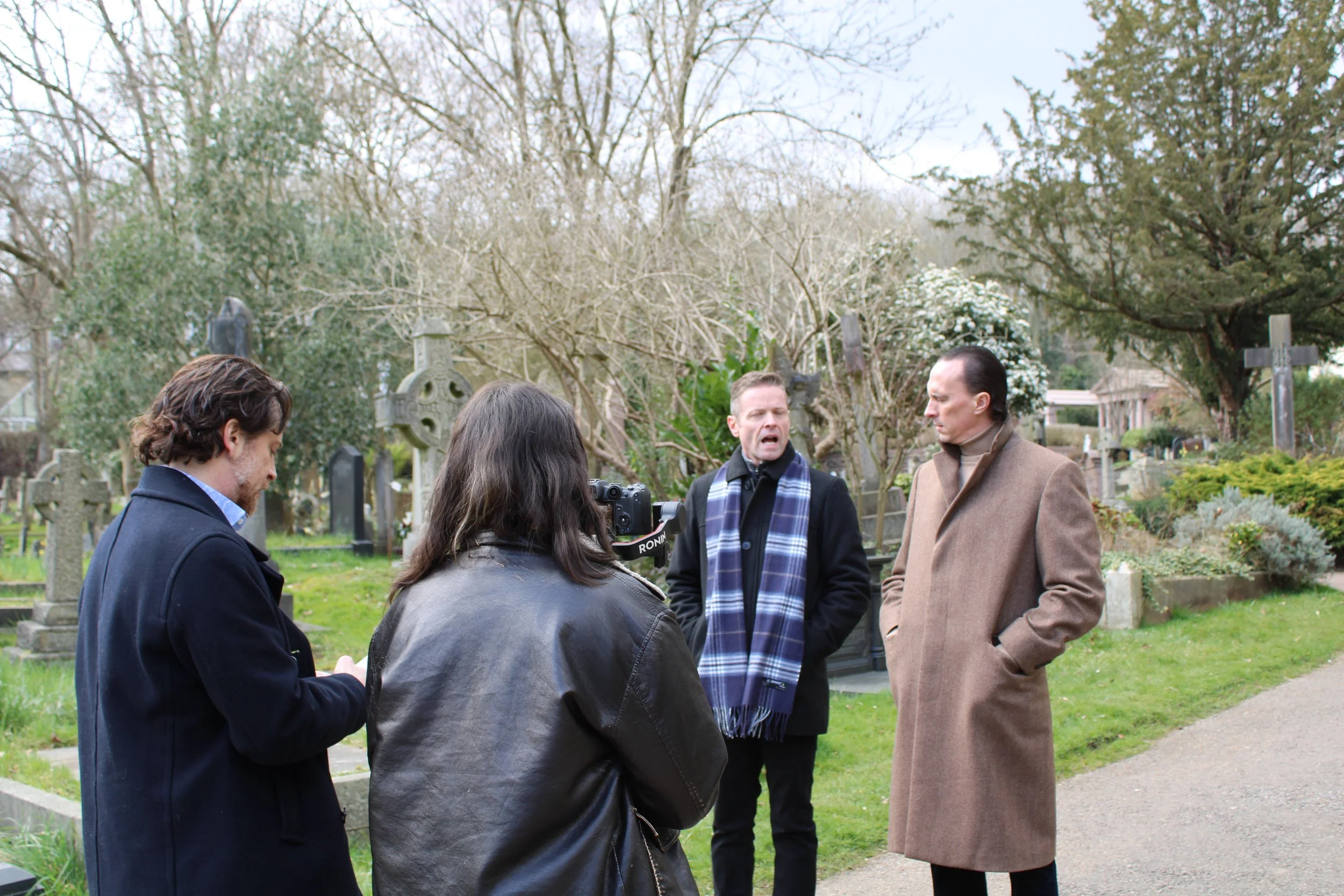 Assistant Professor Michael Carvaines and media production student Megan Groves filming with actors in Highgate Cemetary / photo by Katelyn Lindsey